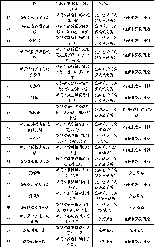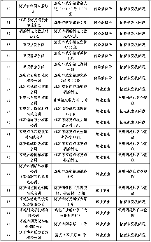 根據國家疾控局綜合司、國家衛生健康委辦公廳和國家中醫藥管理局綜合司《關于印發2024年國家隨機監督抽查計劃的通知》(國疾控綜監督二函〔2024〕83號)、江蘇省衛生健康委員會《2024年江蘇省衛生健康隨機監督抽查實施方案》(蘇衛辦監督〔2024〕2號)、南通市衛生健康委員會《關于印發2024年南通市衛生健康隨機監督抽查實施方案的通知》(通衛監督〔2024〕4號)等要求,9月份,海安市衛生監督所開展了公共場所衛生、醫療衛生、傳染病防治和職業衛生等隨機監督抽查工作,現將抽查結果公示如下: