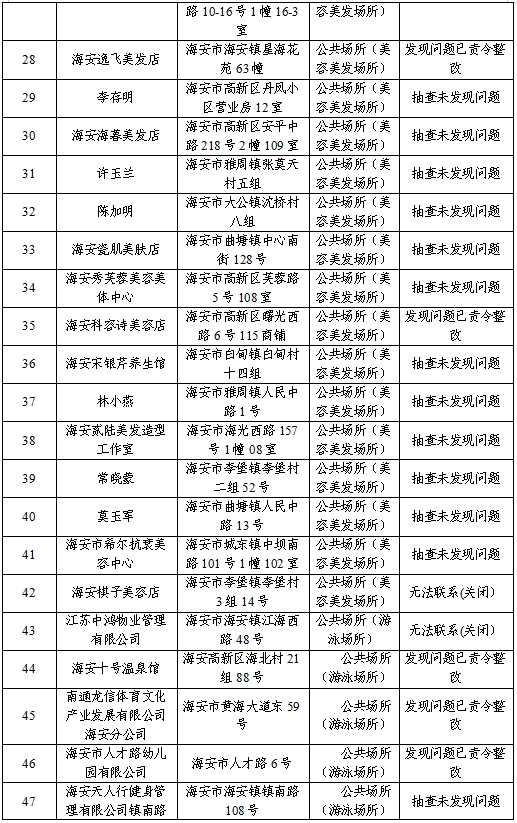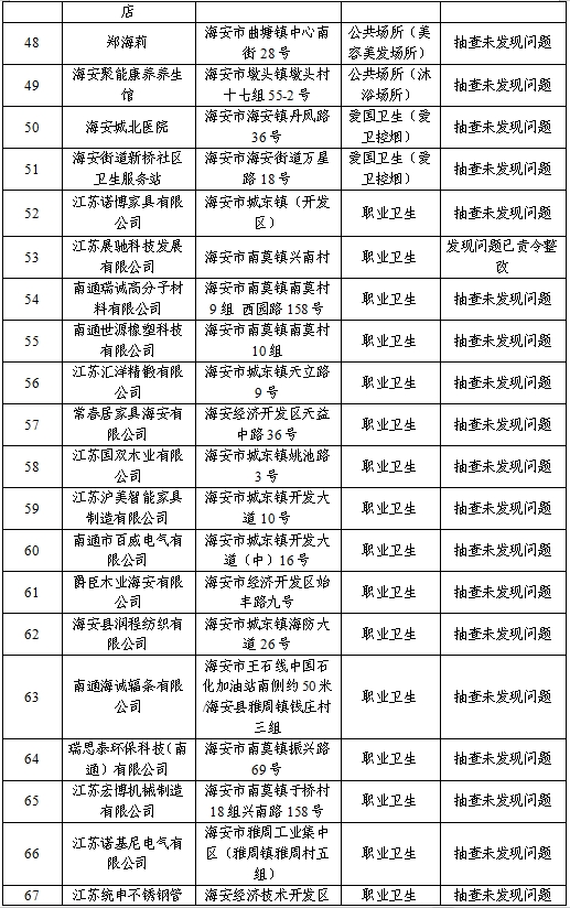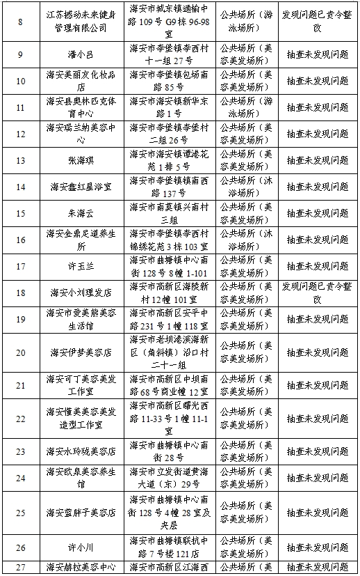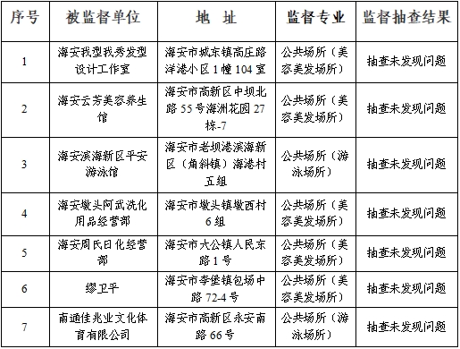 根據(jù)國家疾控局綜合司、國家衛(wèi)生健康委辦公廳和國家中醫(yī)藥管理局綜合司《關(guān)于印發(fā)2024年國家隨機(jī)監(jiān)督抽查計(jì)劃的通知》(國疾控綜監(jiān)督二函〔2024〕83號)、江蘇省衛(wèi)生健康委員會《2024年江蘇省衛(wèi)生健康隨機(jī)監(jiān)督抽查實(shí)施方案》(蘇衛(wèi)辦監(jiān)督〔2024〕2號)、南通市衛(wèi)生健康委員會《關(guān)于印發(fā)2024年南通市衛(wèi)生健康隨機(jī)監(jiān)督抽查實(shí)施方案的通知》(通衛(wèi)監(jiān)督〔2024〕4號)等要求,7月份,海安市衛(wèi)生監(jiān)督所開展了公共場所衛(wèi)生、職業(yè)衛(wèi)生、醫(yī)療衛(wèi)生和傳染病防治等隨機(jī)監(jiān)督抽查工作,現(xiàn)將抽查結(jié)果公示如下: